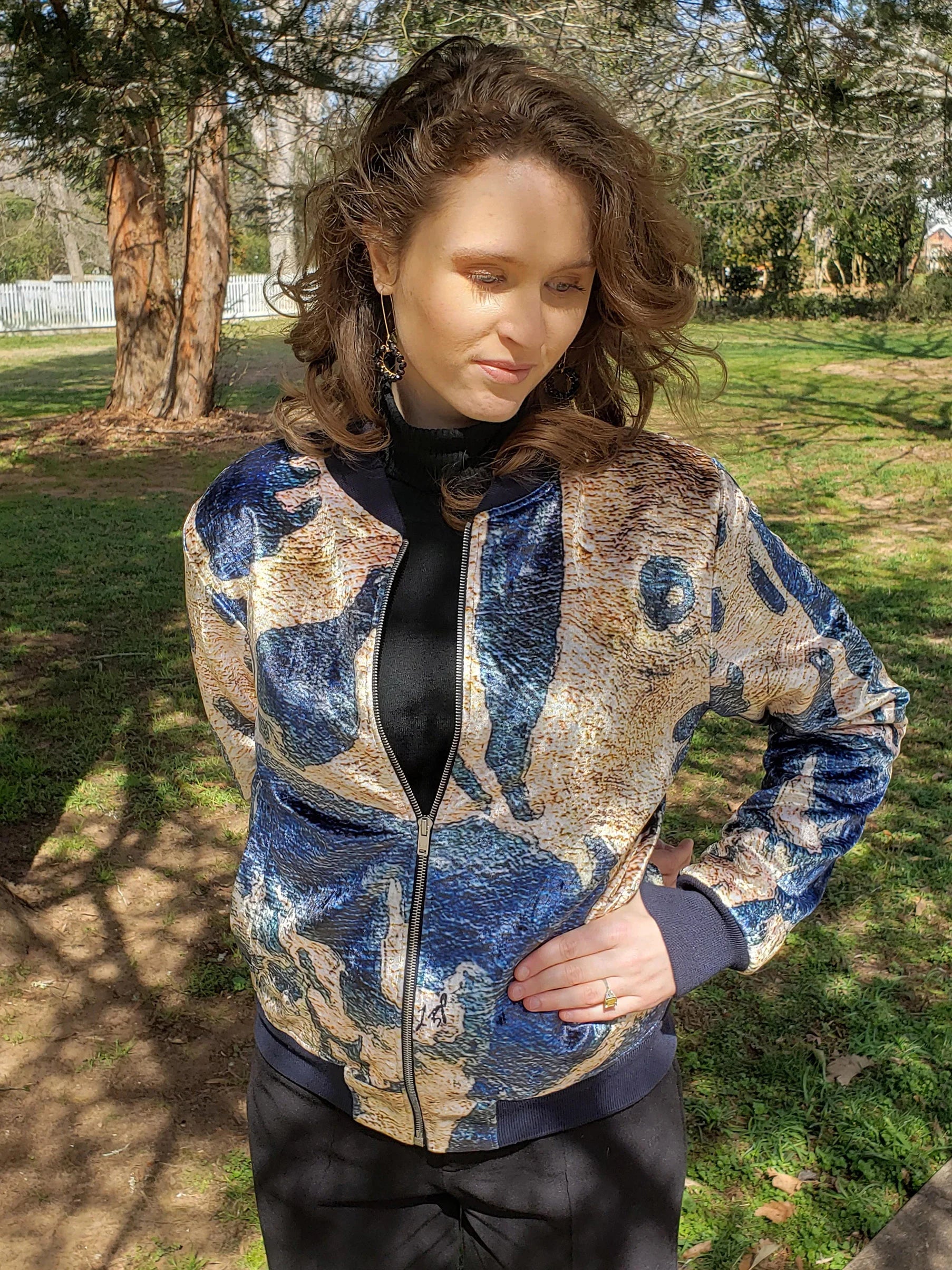 Zipper closure for a secure fit, a ribbed knitted round collar with full length sleeves. This quilted bomber is chic, with Lady Barbara Pinson Artist's design as original artwork. There are a variety of designs to choose that suit your style. Order your Lady B Bomber Jacket today and start enjoying!