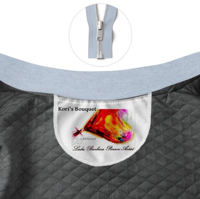 Zipper closure for a secure fit, a ribbed knitted round collar with full length sleeves. This quilted bomber is chic, with Lady Barbara Pinson Artist's design as original artwork. There are a variety of designs to choose that suit your style. Order your Lady B Bomber Jacket today and start enjoying!