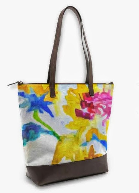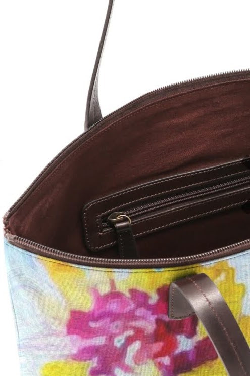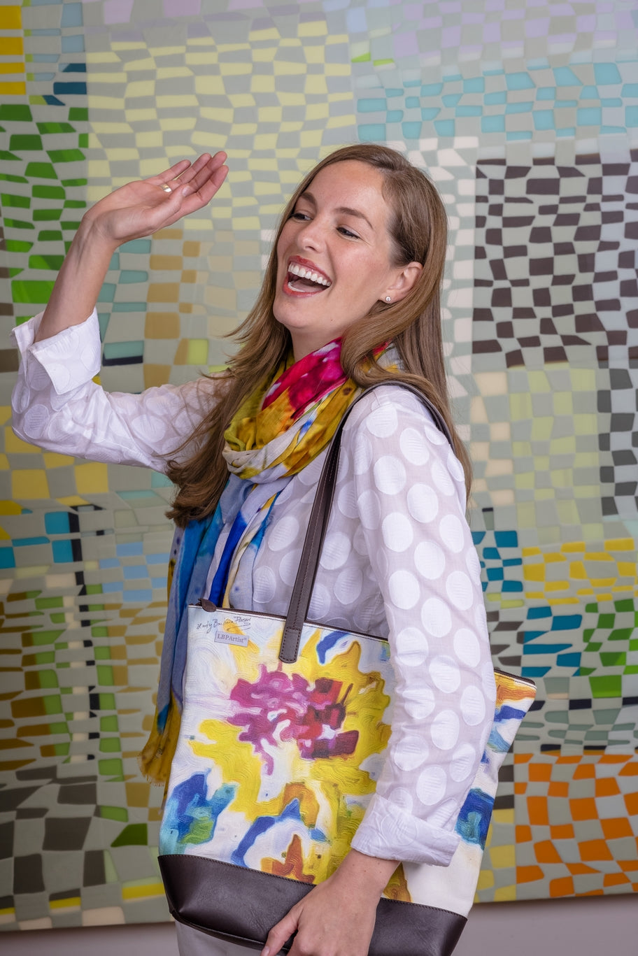 - Made from genuine cow-hide leather and sustainably grown cotton, our Statement Bag is a class act and it is versatile. Custom printed with LBPArtist Wearable Art, it is the perfect accessory to take you from work to drinks and everything in-between. Great travel piece. Will fit a laptop, shoes, lunch goodies, or bathing suit/towel.