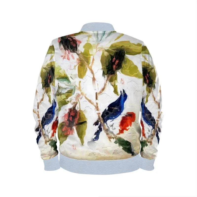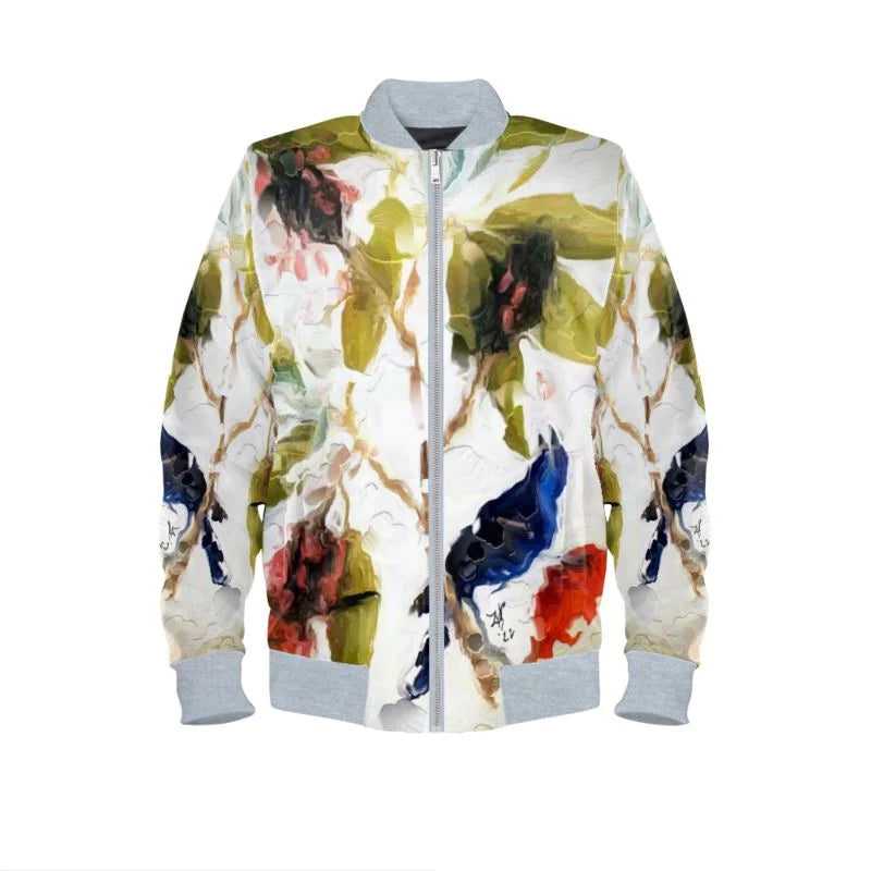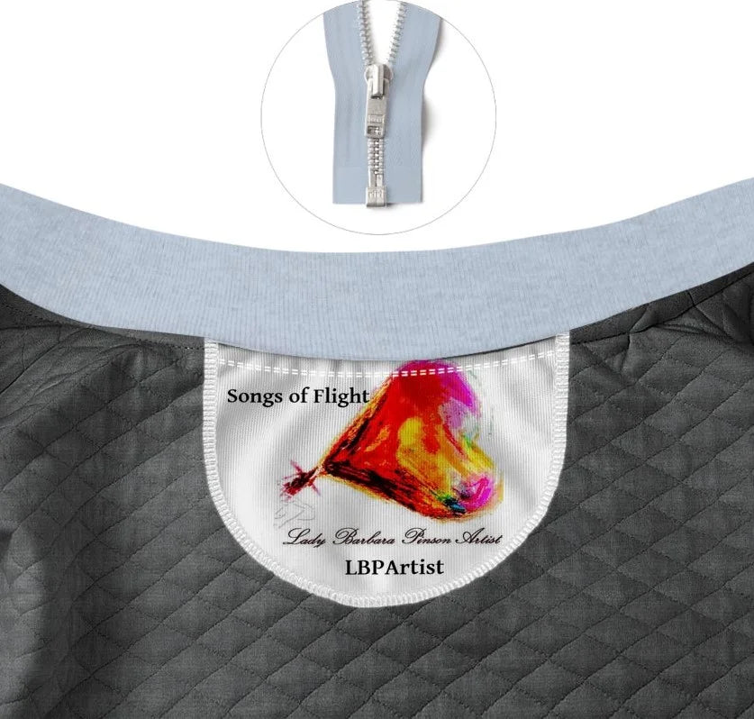 Zipper closure for a secure fit, a ribbed knitted round collar with full length sleeves. This quilted bomber is chic, with Lady Barbara Pinson Artist's design as original artwork. There are a variety of designs to choose that suit your style. Order your Lady B Bomber Jacket today and start enjoying!